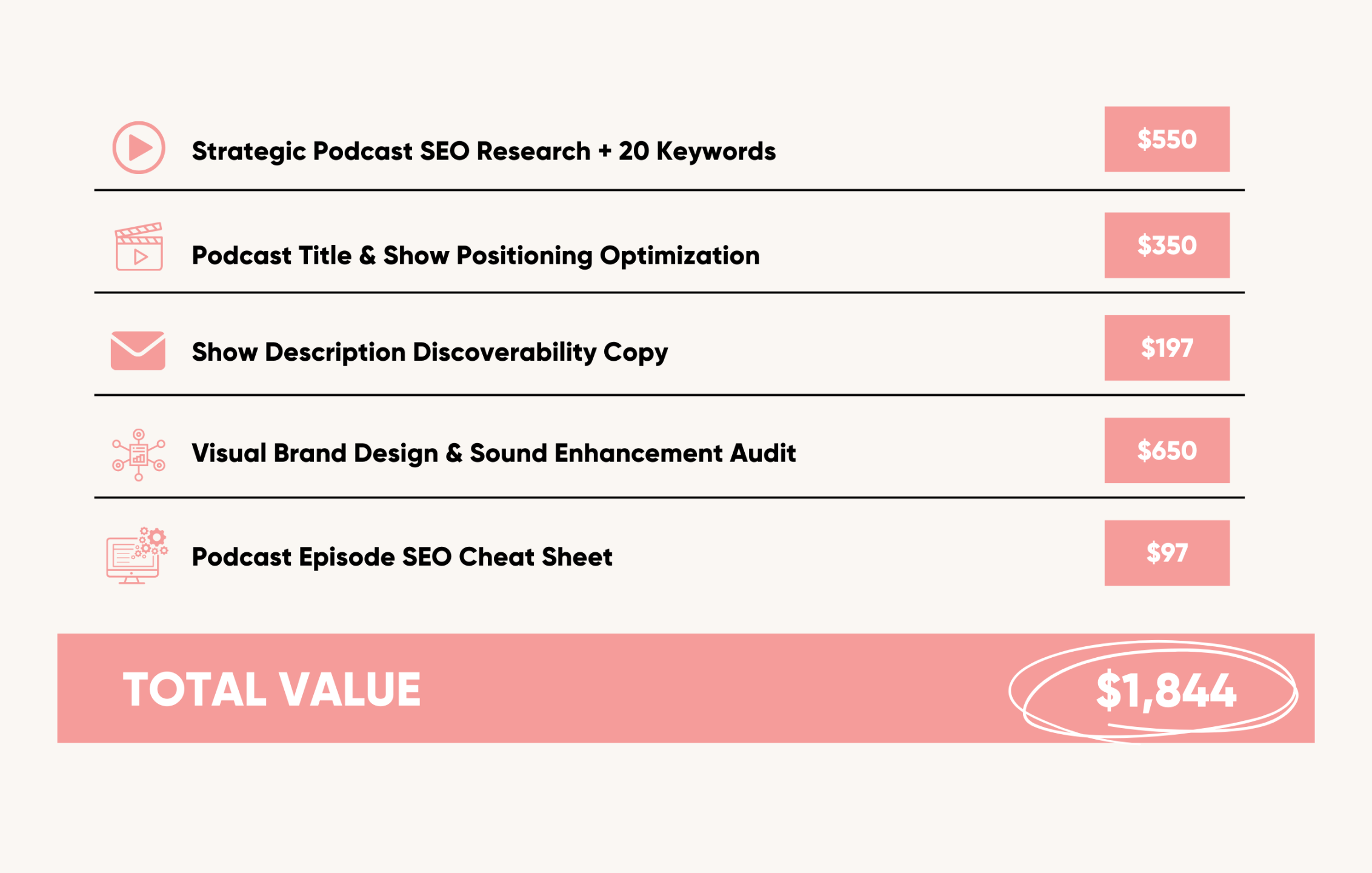 Sure can! When you secure your Podcast Growth Strategy, you get you’ll get everything you need to position your podcast for discoverability, attract the right listeners, and set your show up for sustainable growth — including: