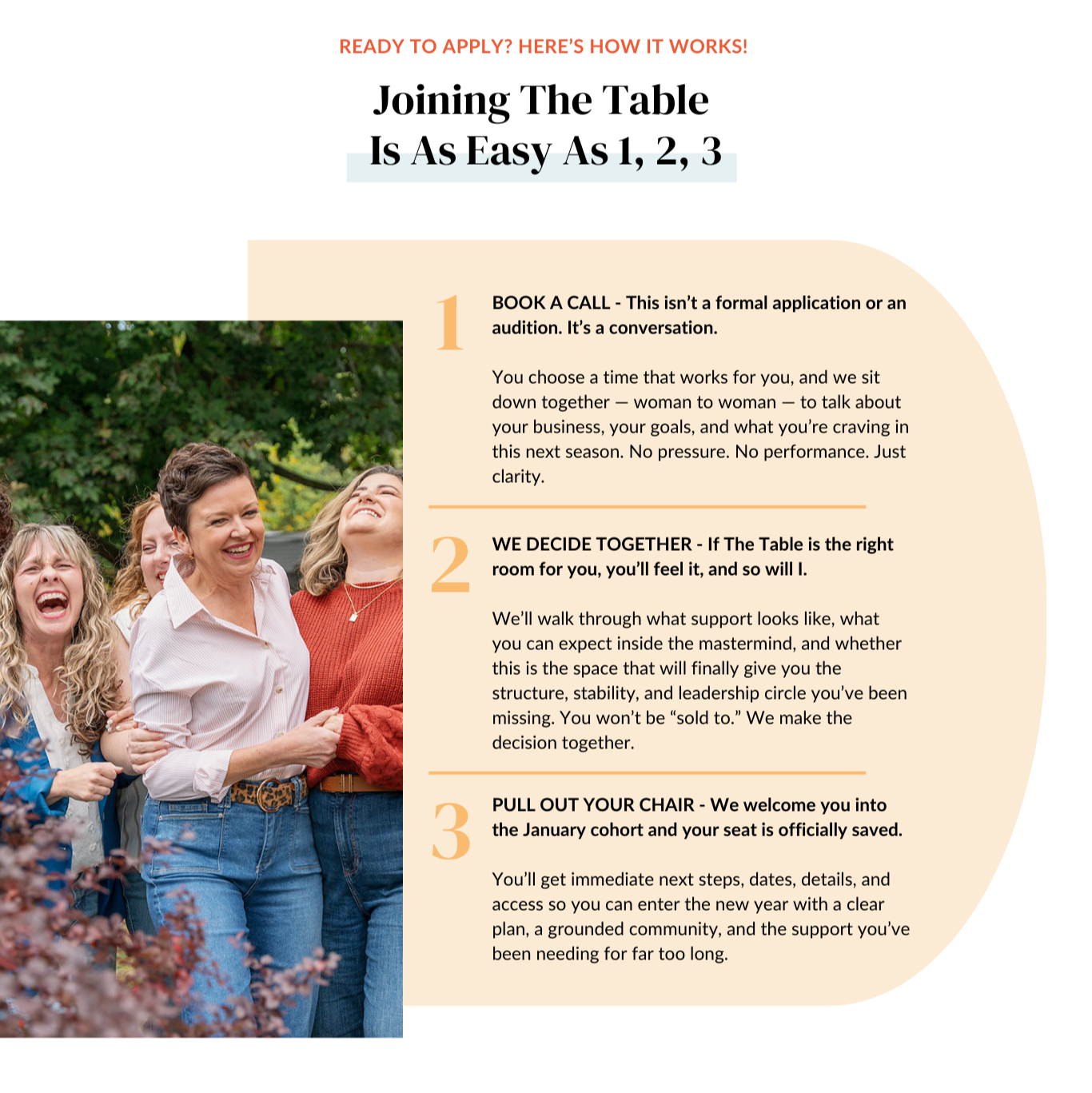 Inside The Table, you’re not joining another passive group — you’re stepping into a circle of sharp, thoughtful, ambitious women 40+ who are building real businesses and want real support.